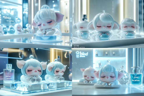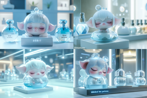 many types of perfume bottles, shaped like ceramic glaze glass, with the top adorned with a round, cute piglet, featuring two adorable ears, and a cute, expression etched on the pig's nose. the design combines the blind box hand-painted image of perfume, with the color predominantly in light blue. the face is decorated with dewdrop-like embellishments, with a serene expression, as if it's sleeping with its eyes closed. the combination of the perfume sprayer, the base, cartoon characters, cuteness, details, and various bottle shapes showcase the perfume. it is part of the "blind box perfume" series art exhibition in the future perfume museum, featuring multiple colors, a blind box perfume gift display stand, hyper-realism, ultra-modernism, sci-fi feel, high-definition details, futurism, ultra-clear, details, blender.