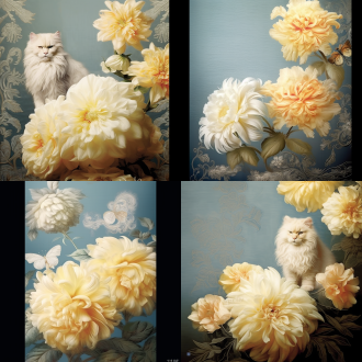 中国风。鹅黄色牡丹,工笔画风格,全景镜头,刺绣质感,手工痕迹,丰富细节,暖色调,精致。花瓣上撒金粉,颗粒感,内发光。花下有一只猫仰视。 英文 chinese style. duck egg yellow peonies, in the style of fine brushwork, panoramic shot, embroidery texture, handcrafted, rich details, warm tones, exquisite. gold powder sprinkled on the petals, granular texture, internally luminous. below the flower, there is a cat looking up in admiration. 参数信息 绘制模型mj5.1(艺术增强) 图片比例9:16 图片尺寸1632 x 2912 单线图